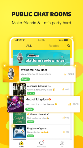 Neue Benutzer werden in einem multiktorischen Raum begrüßt; Ob Gesangswettbewerbe, ein Talent-Show-Zimmer, ein Zimmer zum Lesen von Poesie und Geschichten, ein Zimmer zum Lesen der Sprache, oder neue Freunde kennenlernen, zum täglichen Chat und anderen Themenräumen, die darauf warten, dass Sie sich anschließen.