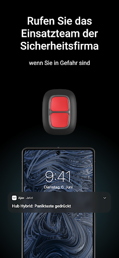 Drücken Sie in einem Notfall den Panikknopf in der App, am Schlüsselanhänger oder auf der Tastatur. Ajax verständigt daraufhin das Einsatzteam des Sicherheitsunternehmen oder den Rettungsdienst und informiert alle Benutzer des Systems über den Vorfall.