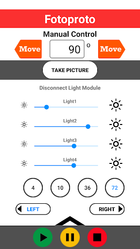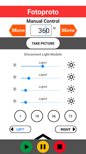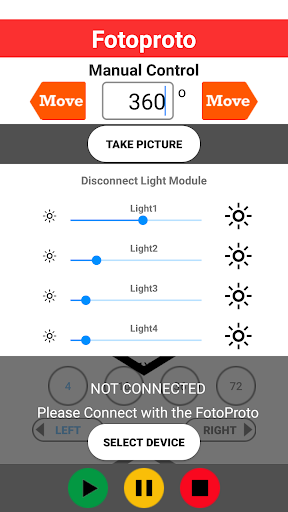 This application is needed to control the Fotoproto studio. This APP contains the controls to rotate the turntable, take pictures with your DSLR camera and dim the led light module(s).