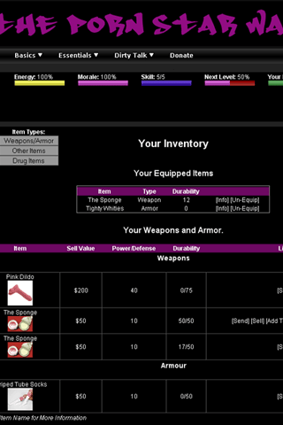 The Porn Star Wars is a game filled with violence, nudity, and adult material. You can buy sex slaves, pimp out sluts, kill your enemies, and meet new people, in the porn star world, anything goes. This game is guaranteed to be the most original and most exciting FREE online adult only RPG. You will not be disapointed, and the best part is, its free, so Register Now!