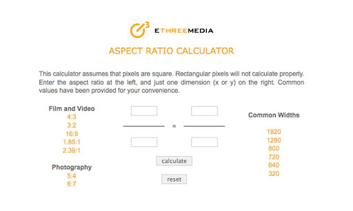 Der Ethree Media Aspect Ratio Calculator ist eine kostenlose Ressource, mit der Video-Editoren, Animatoren, Motion Graphics-Künstler und sogar DPS und Fotografen dabei helfen, zu bestimmen, wie Pixel mit nur wenigen einfachen Einträgen auf ein einfaches Formular in jedes Seitenverhältnis übersetzen.Gemeinsame Aspektverhältnisse und Pixelbreiten sind für Ihre Bequemlichkeit bereitgestellt.Hinweis: Dieser Rechner geht davon aus, dass alle Pixel quadratisch sind, sodass DV- und Anamorph-Auflösungen nicht ordnungsgemäß berechnen!