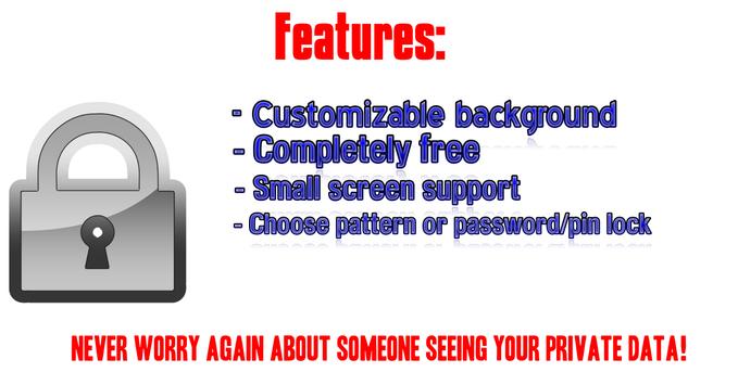 Protect your apps with a password or pattern lock Quick and easy!Lock Whats, Face, and all apps you want, Never worry again about someone seeing your private data!Features:- Customizable background- Completely free- Small screen support- The fastest on the market- Choose pattern or password/pin lock- Change pattern color to white, green or blue- Hide App Locker from applications so nobody can see it's installed- Custom unlock message- Also lock system apps