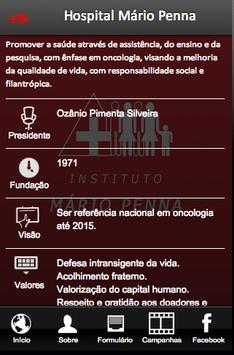 O Hospital Mário Penna é um dos maiores hospitais especializados no tratamento de pacientes com câncer e é um dos mais renomados e conhecidos hospitais que oferece tratamento para pacientes carentes através do SUS - Sistema Único de Sáude - e também através de doações. Conheça, neste aplicativo, mais sobre esta importante obra, mantida pelo Instituto Mário Penna há mais de 40 anos e seja, você também, um ajudador desta maravilhosa obra social.