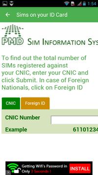 The app verifies number of sims used by any user inside Pakistan. You are just to enter your CNIC with out any space dot or dash. And you will find the number of sims in your name.