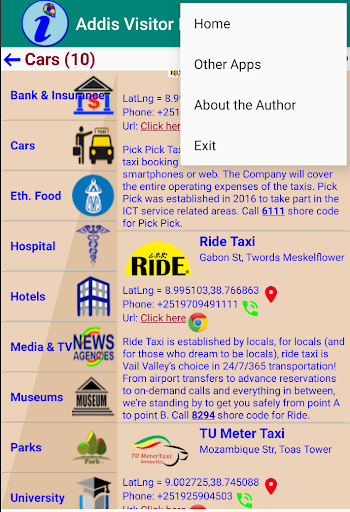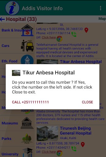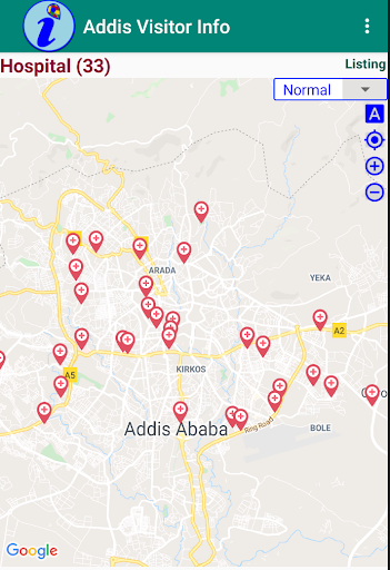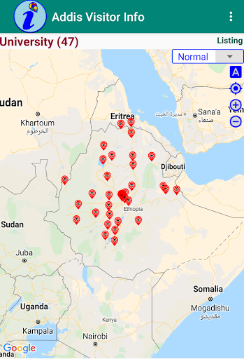 Die Besucherinfo Addis Ababa App kann verwendet werden, um einen großen Standort von Institutionen wie Museen, Parks, News Medien, Krankenhäuser, Ridieren, Hotels usw. zu finden