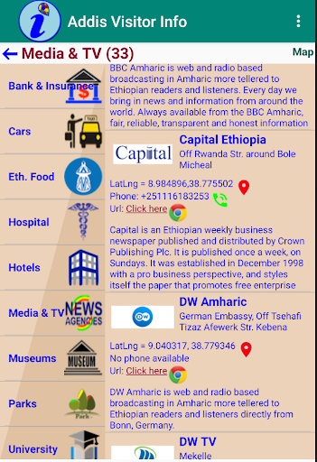 Addis Ababa, like Museums, Parks, Hospitals, Hotels, News Media, Car, University, etc. Some more data is added in the this version. Minor change in map section.