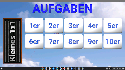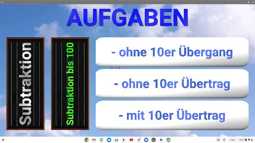 Die 1x1 Aufgaben sind gruppiert nach der jeweiligen Reihe (1er Reihe, 2er Reiher, 3er Reihe usw.). Übungen zu Addition und Subtraktion können getrennt nach Zahlenraum (10er, 20er, 100er) gewählt werden – jeweils mit oder ohne Zehnerübergang und -übertrag.