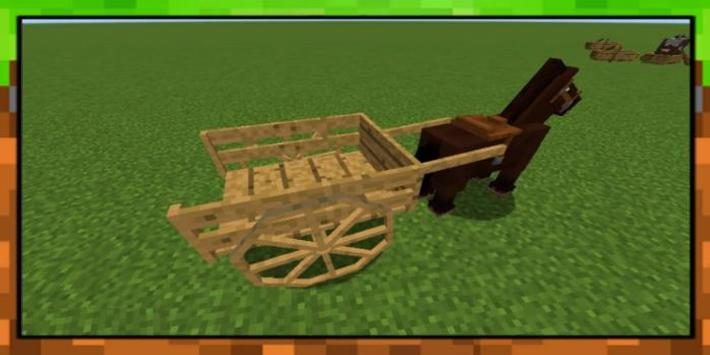 Horse Carts Mod adds a horse cart that can be attached to a rideable entity (horse, donkey,…), contain stuff (equal to a double chest) and can even be ridden by a player. The amount of stuff on the back of the cart changes depending on how many slots of the carts inventory you fill.