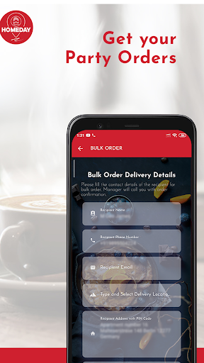 Now you can place your Party Orders or Bulk Orders with Homeday. Send us where we should deliver along with the date and time of delivery via Homeday. With this hassle-free interface you can make your orders easily and our manager will contact you for confirming the details you have given, before accepting your order. So now all your parties are just under your fingertip.