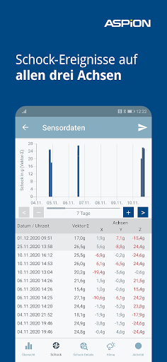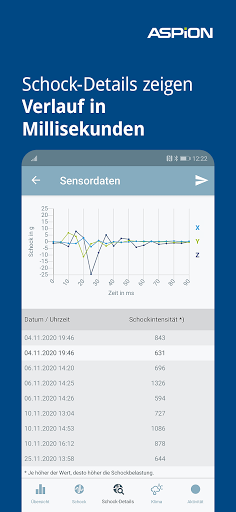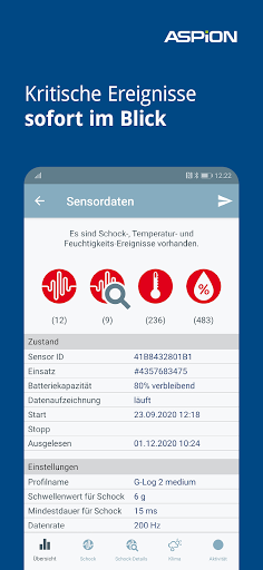 Die smarten ASPION G-Log Schocksensoren sind intelligente Datenlogger zur Protokollierung von Schock / Stoß / Erschütterung, Klimadaten wie Temperatur und Feuchtigkeit sowie einfache Lagevisualisierung bei Transporten. Lesen Sie mit der kostenlosen App die Sensordaten schnell und einfach aus – sofort erhalten Sie einen Überblick und Details über aufgezeichnete Transport-Ereignisse!