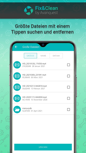 Bei dieser Bereinigung werden große Dateien entfernt. Die Funktion zeigt an, welche Dateien auf dem Telefon mehr als 50 MB Speicherplatz belegen.