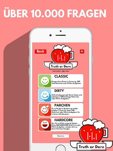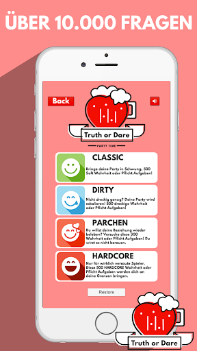 Mache mit dieser Wahrheit oder Pflicht App deine Parties unvergesslich und spiele heiße Spiele für Erwachsene, Paare oder Freunde. Die heißesten Wahrheiten oder Pflichten warten im Store auf dich!