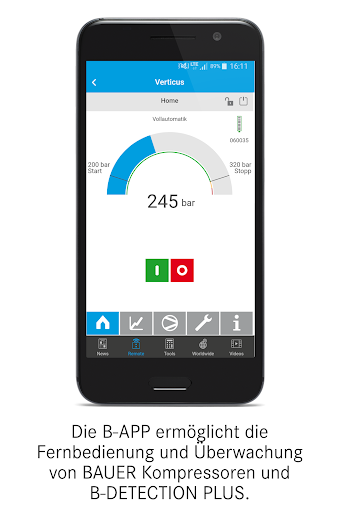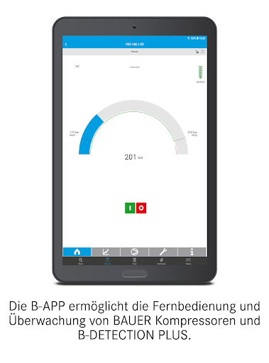 Die B-APP ermöglicht die Fernbedienung und Überwachung von BAUER Kompressoren mit der neuen BAUER Steuerung B-CONTROL MICRO im lokalen WLAN. Auf dem jeweiligen Smartphone oder Tablet können z.B. aktuelle Ist-Werte des BAUER Kompressors oder des B-DETECTION PLUS in Echtzeit abgelesen werden. Technische Voraussetzungen finden Sie auf unserer Homepage unter bauer-kompressoren.de bzw. in den jeweiligen technischen Datenblättern.