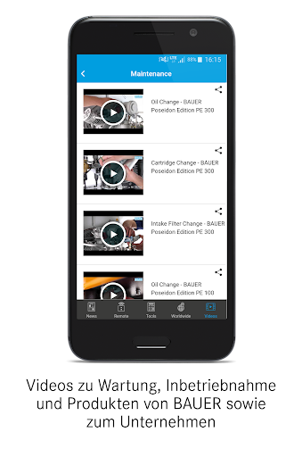 Kurze Videos der Bereiche Unternehmen, Produkte und Service. Diese veranschaulichen allgemeine Informationen zur BAUER GROUP und den BAUER Produkten sowie zur Wartung und Inbetriebnahme von BAUER Kompressoren.