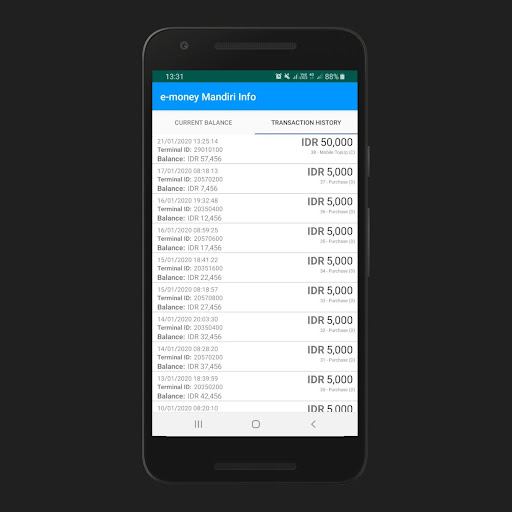 Diese Anwendung ist nützlich, um Informationen auf Ihrem unabhängigen E-Money-Karten-Kontostand zu überprüfen.Neben Balanco sind verschiedene Funktionen Informationen zur Geschichte der letzten 10 Transaktionen in dieser Anwendung.