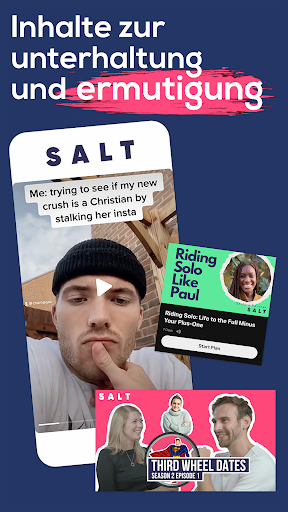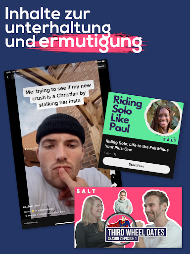 SALT ist die preisgekrönte christliche Dating-App, die von GQ, Vogue, BBC und andere globale Medien vorgestellt wurde. SALT wird von Christen für Christen entwickelt. Schließe dich noch heute 10.000 christliche Singles an. Du kannst kostenlos beitreten, dein Match finden, chatten oder für zusätzliche Funktionen ein Abo abschließen.