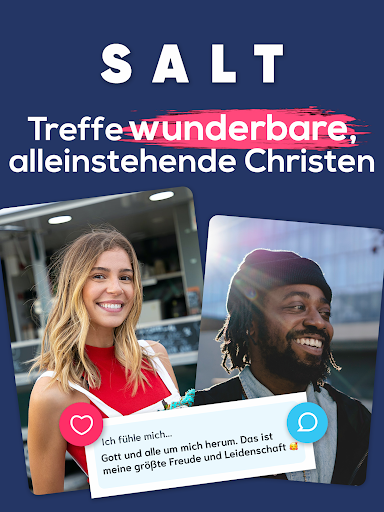 Zehntausende Christen weltweit - in Deutschland, UK, Irland, Australien und weitere Länder- nutzen die SALT-App, um mit anderen Christen in Verbindung zu treten. Wieso solltest du die kostenlose christliche Dating-App SALT verwenden? SALT ermöglicht christliche Singles, ganz einfach andere Singles kennenzulernen, die den gleichen Glauben teilen. Außerdem können örtliche Präferenzen eingestellt werden, damit alle Nutzer in Städten wie München, Hamburg, Berlin, Frankfurt, Düsseldorf, Leipzig, Dublin, Cork, London, Manchester, Liverpool, Edinburgh, Belfast, Cambridge, Sydney, Melbourne, Brisbane, Perth, ACT gefunden werden!