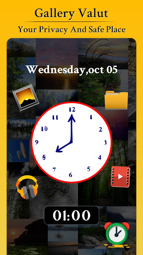 Lock gallery hide pictures and videos and keep secret logic of your gallery vault. Time lock clock vault provides everything required by keep safe your private photo video locker. It has clock lock screen front of the Gallery Vault.
