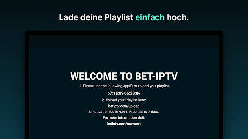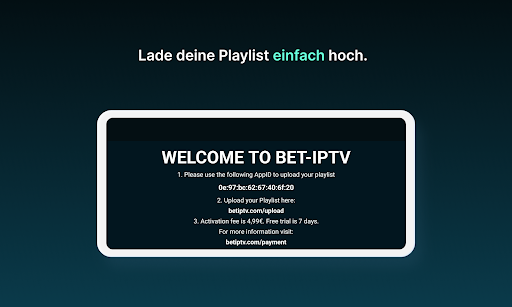 *BET IPTV enthält keine Kanäle oder Wiedergabelisten. Sie müssen Ihre eigenen Wiedergabelisten mitbringen und auf unserer Upload-Seite unter https://betiptv.com/upload hochladen.