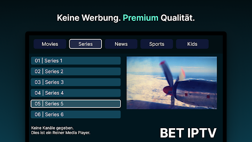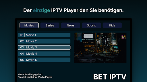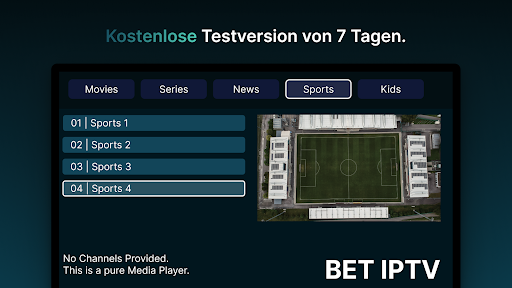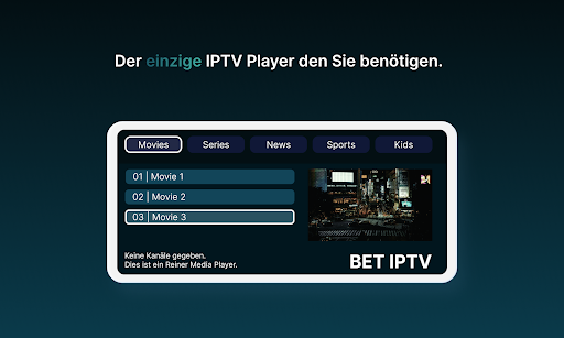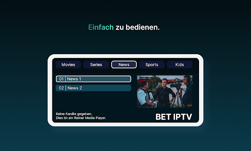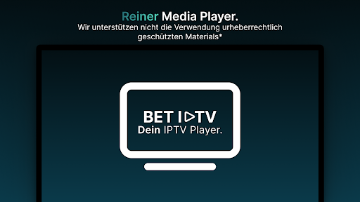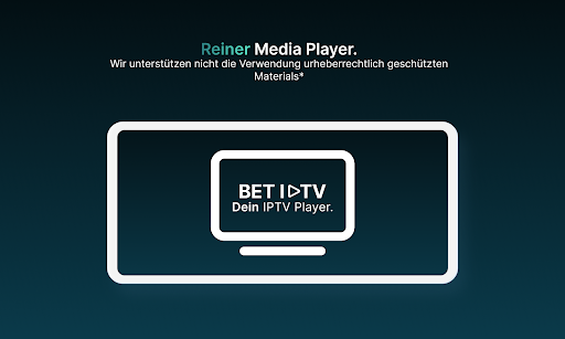 *Es werden keine Informationen über Kanäle oder Wiedergabelisten bereitgestellt, und alle Anfragen bezüglich Kanälen/Wiedergabelisten werden ignoriert. Außerdem befürworten oder unterstützen wir in BET IPTV nicht die Verwendung urheberrechtlich geschützter Materialien in unserer App.