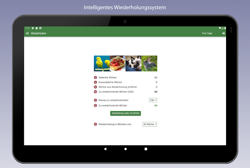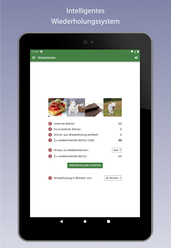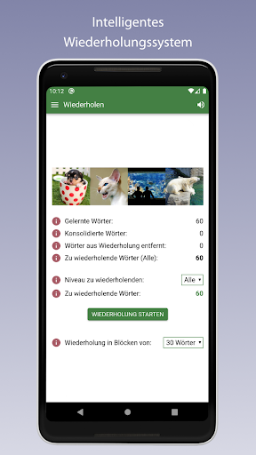 - Intelligenter Wiederholungsmodus, der dafür sorgt, dass Sie die Wörter gemäß den Treffern und Fehlern regelmäßig wiederholen. Je öfter Sie ein Wort nicht wissen, desto öfter wird es abgefragt, damit es im Gedächtnis hängen bleibt.