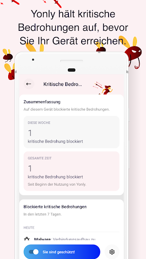 - Läuft im Hintergrund, für jeden Browser, jede Anwendung und jede Systemkomponente. Anders als andere Apps schützt Yonly das gesamte Telefon;
