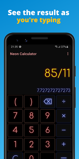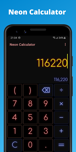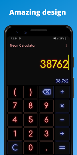 Alltagsmathematik-Rechner mit allen Grundfunktionen (Addition, Subtraktion, Division, Multiplikation und grundlegender Prozentsatz) und einer anpassbaren Big-Number-Neonfarben-Tastatur mit einem großen Ergebnisdisplay.