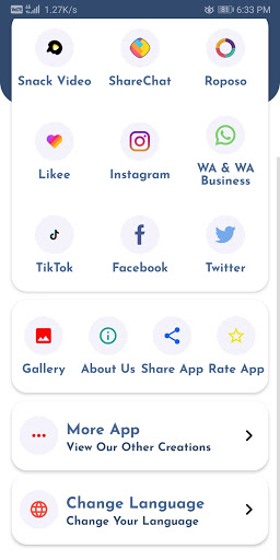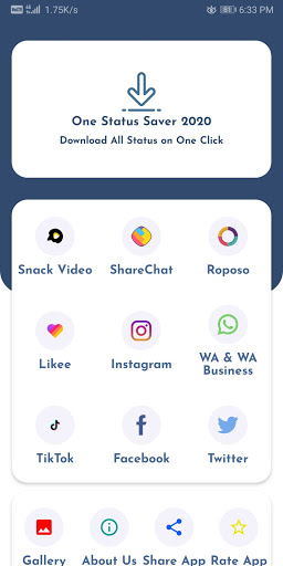 Alle in einem Statusschoner ist einAndroid All Social Media-Status-Video- und Bilder-Downloader-App.Sie können SAE, ROPOSO, WhatsApp und WhatsApp BusinessStatus Saver, Tik Tok, Sharchat, Twitter, Snackvideo's und Instagram-Videos und Bilder mit allen in einem Status-Sparer sparen.Sie können den Status des Sake-Status herunterladen. Sie können sie leicht aus der App teilen.
