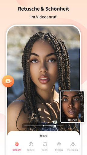 Diese App bietet hochwertige kostenlose Beauty-Funktionen, z. Gesichtsglättung, Faltenentfernung, Zahnaufhellung, Hautverbesserung usw., damit Sie in WhatsApp-Videoanrufen jederzeit schön sein können. Anpassbare Beauty-Tools ermöglichen Anpassungen Ihres Beauty-Looks in Echtzeit, einschließlich der Entfernung von Akne und Hautunreinheiten, der Gesichtsanpassung, der Augenaufhellung, der Lippenverbesserung und mehr.