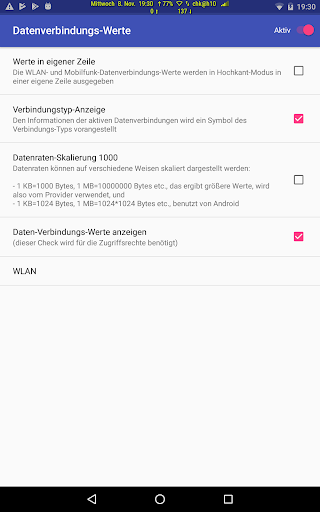 : Verbindungstyp, Roaming-Info, Provider, Up-/Download-Info, Signalqualität, VPN- und Roaming-Anzeige, , tägl. oder monatl. Datenvolumen.