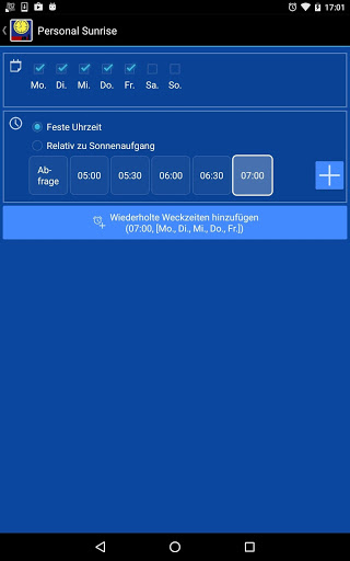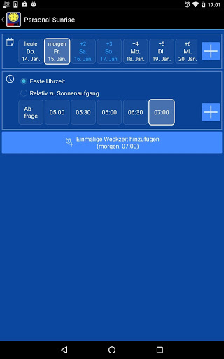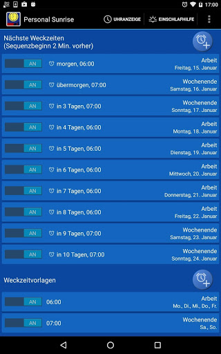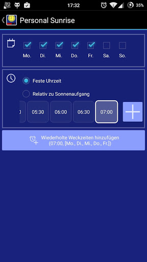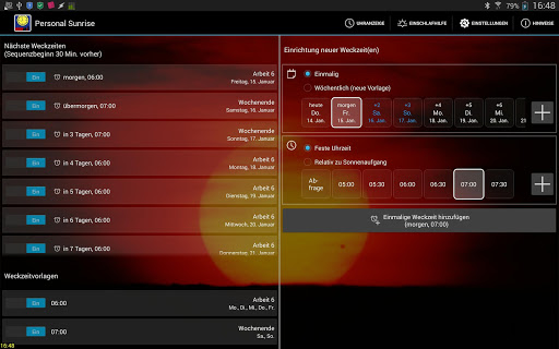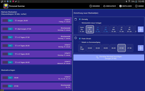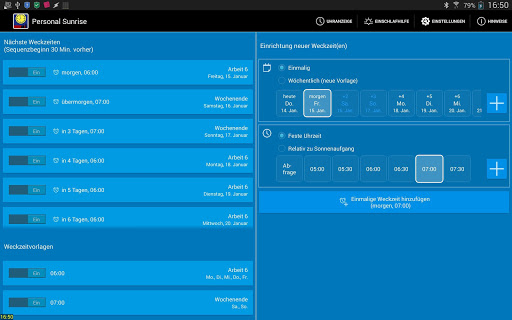 'Personal Sunrise' bietet Ihnen viele Konfigurationsmöglichkeiten.Mit einem Klick ein- oder ausschaltbare Wochen-Weckzeitvorlagen sind genauso möglich wie Einzeltag-Wecktermine.