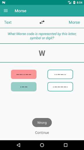 Diese Morse -Code -Anwendung unterscheidet sich etwas anders als die meisten bei Google Play.Sie können nicht nur Text in Morsecode und umgekehrt übersetzen, sondern auch Morsecode nach Quizfragen in Ihrer Freizeit lernen..