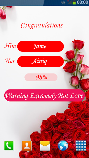 If you want to know love percentages about your “Love partner” then download this “Super Love Calculator” Application right now. “Super Love Calculator” can calculate accurate real love percentage between couples. Using this “Love calculator” you will be able to know the extreme level of “Love” with your partner. Entering the name of you and your “Love partner” you will see the “Love percentage”. This “Super Love Calculator” will show you the instant results of your “Love percentage” with your partner. You can also share the results with your love partner and also with your friends through email, SMS, Facebook, Twitter and WhatsApp. You will also enjoy the beautiful graphics of this “Super Love Calculator” app.