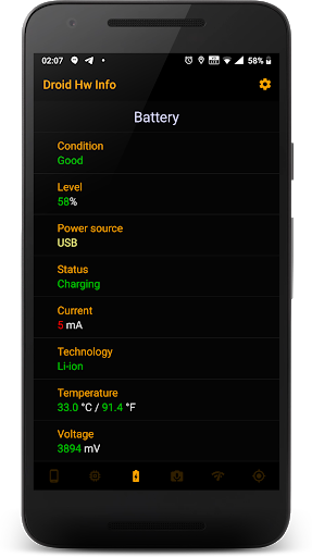 Droid HW Info ist eine Hardwareinformation und eine diagnostische Anwendung für Ihre Android-Geräte. Es versucht, die Hardware Ihres Geräts, Ihre Batteriedaten zu erkennen, und zeigen Sie auch die Ausgabe der Sensoren Ihres Geräts an (beachten Sie, dass einige Geräte möglicherweise keine Sensoren haben). Es wird auch versucht, den Gesundheitszustand Ihres Akkus zu schätzen und wie viel Ladung er halten kann - aber nehmen Sie das mit einer Prise Salz, wenn die Schätzung nicht zu 100% genau ist.
