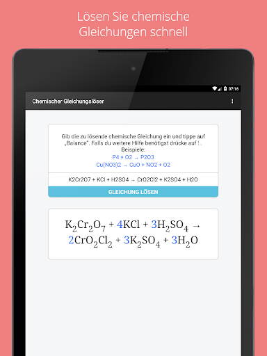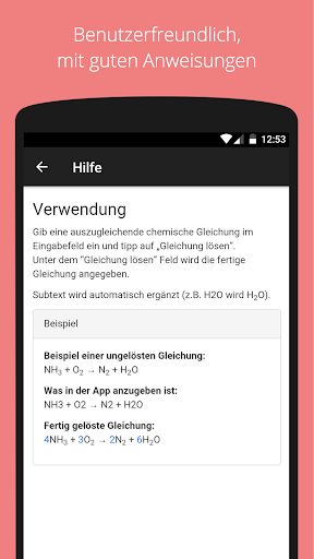 Gib eine auszugleichende chemische Gleichung im Eingabefeld ein und tipp auf „Gleichung lösen“. Unter dem “Gleichung lösen” Feld wird die fertige Gleichung angegeben.
