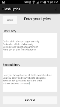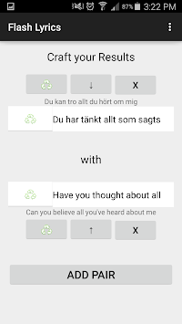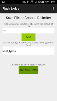 With Flash Lyrics you can quickly and easily produce, either to save on your phone or email to a friend, files readable by Anki, Excel, and other platforms for data and/or studying, in 3 simple steps:
