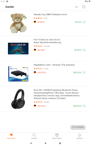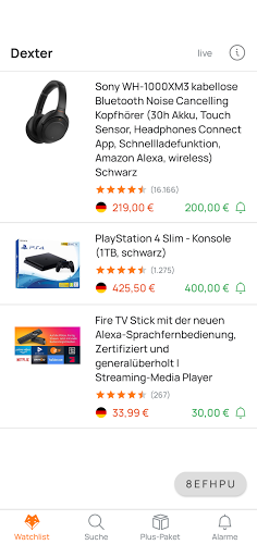 Sei schlau und spare Geld mit Dexter! Füge Amazon-Artikel zur Watchlist hinzu, lege deinen Wunschpreis fest und warte. Dexter benachrichtigt dich, sobald dein gewünschter Preis erreicht ist.