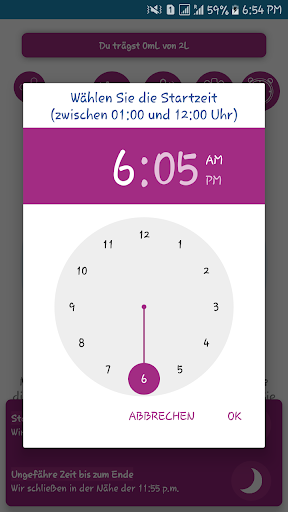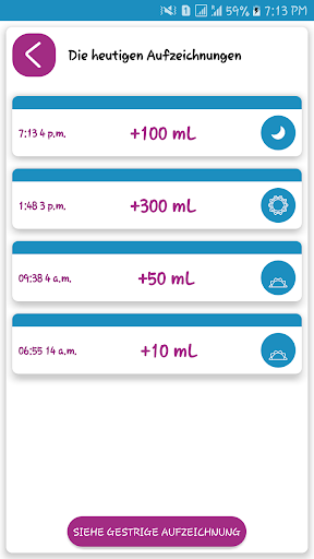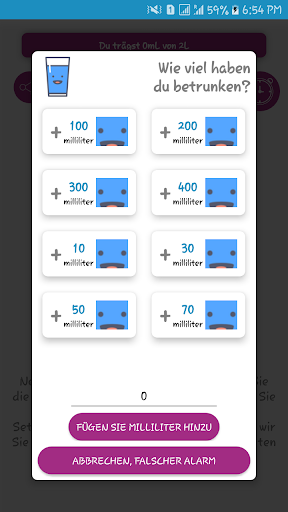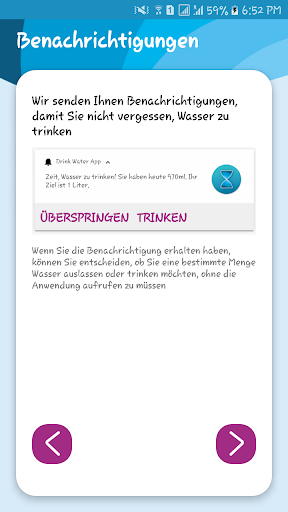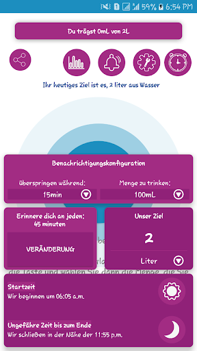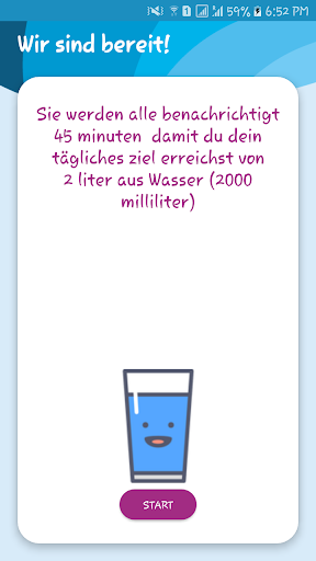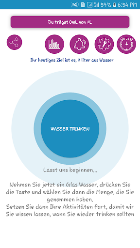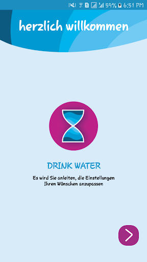 Setzen Sie sich ein Ziel, wählen Sie eine Zeit und los geht's! Die App sendet Ihnen Benachrichtigungen, damit Sie nicht vergessen, Wasser zu trinken. Ein Chronometer auf dem Bildschirm zeigt ungefähr an, wann der nächste Alarm eintrifft.