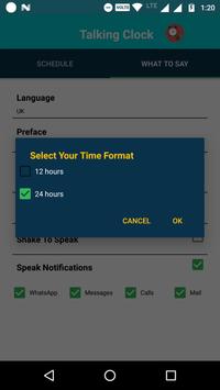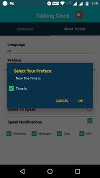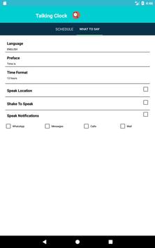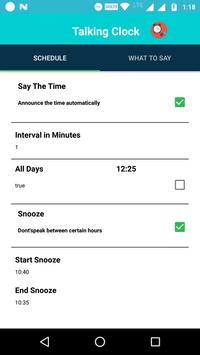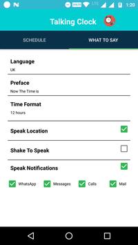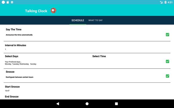 1.Enjoy automatic time announcements at regular intervals. Say the Time can tell you the time every minute, 5 minutes, 10 minutes, 15 minutes, 20 minutes, half hour, or hour. 2.Set a snooze period to turn off time announcements between specific hours. That way you won't be bothered when you're asleep! 3.Customize the spoken announcement. Hear the time in 12 hour, 24 hour. 4.Set the particular week days to say the clock. 5.Set your preface to speak text of the clock 6.Shake to tell the current system time. 7.set your volume for speaking text 8.You will get the Notification for the say the time is in ON and also if you want stop the speaking you will stop the notification bar. 9.for shortcut we developed the widget for this app.