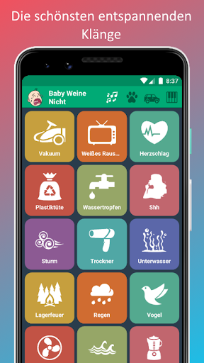 Die beste Qualität entspannender Klänge in unserer Anwendung. Entspannen Sie Ihre Babys und genießen Sie beruhigende Geräusche. Wir haben die schönsten Kolik-Baby-Sounds für Sie zusammengestellt. Wenn Ihr Kind weint, ist diese App für Sie, weinen Sie nicht Baby, weinen Sie nicht. Sie können auch pädagogische Tiergeräusche, pädagogische Autoklänge und pädagogische Instrumentengeräusche verwenden, um Ihre Kinder zu unterrichten.
