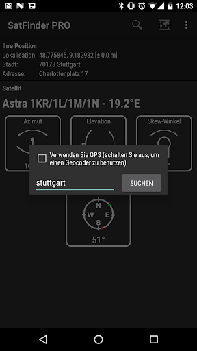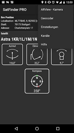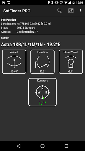 Programm, das die Einstellung der Parabolantennen erleichtert. Basierend auf der GPS-Position oder eingetragener Adresse findet die App die Fluchtwinkel und Azimutwinkel der Parabolantenne.