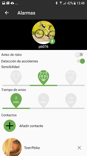 Ist ein ELALL, ein Unfallalarm, da er einen Herbst erkennt und warnt in Echtzeit, an die Kontakte, die Sie zuvor angedeutet haben, nicht nur, dass Sie einen Unfall hatten, sondern um Ihren Standort. Dafür ist es notwendig, dass diese Kontakte auch die PBIKE-App heruntergeladen haben, da die Alarme auf die App springen. Um den Unfallalarm in Bearbeitung zu setzen, müssen Sie den Alarm nur anpassen, um die Sensibilität der Sensoren abhängig von Ihrer Fahrt auf dem Fahrrad zu wählen, so dass Sie den Alarm gegen verschiedene Arten von Fall überspringen können, und Sie können das auswählen Wartezeit, seit Sie den Unfall erleiden, bis Sie den Alarm überspringen möchten. Es gibt Zeiten, in denen der Fall des Fahrrads mild ist, und Sie müssen niemanden von Ihrem Mischap benachrichtigen. Der Mehrwert ist, dass die PBike-App die Kontakte nicht nur dafür warnt, dass Sie auf dem Fahrrad fallen, sondern den genauen Punkt, in dem Sie den Unfall erlitten haben. Auf diese Weise wird die Unterstützung des Radfahrers schnell und präzise sein.
