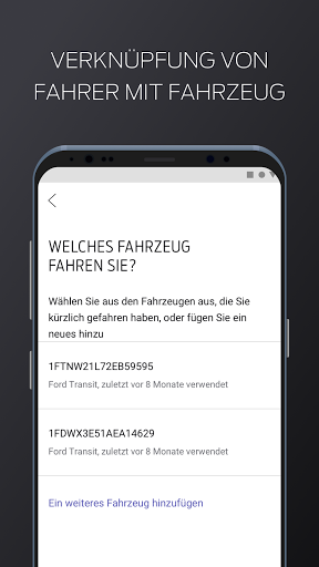 • Verknüpfung von Fahrer mit Fahrzeug. Wählen Sie die Daten des von Ihnen gefahrenen Fahrzeugs aus und leiten Sie diese an Ihren Vorgesetzten weiter