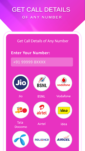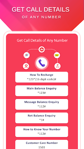 Vollständige Informationen zum Überprüfen des Anrufverlaufs Andere Nummer. So erhalten Sie Anrufdetails einer beliebigen Nummernanwendung den indischen Prepaid-Telekommunikationsbenutzern, um die Nummern für bestimmte Vorgänge wie Aufladung, Haupt-, Botschaft, Netto-Balance-Anfrage zu finden, die eigene Nummer und Kundendienstnummer zu finden. Ab sofort unterstützt die App Telekommunikationsbetreiber wie Airtel, Aircel, Idee, Vodafone, Unrorde, Tat Docome, BSNL und Reliance.