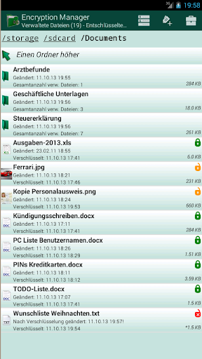 Encryption Manager ist ein Dateimanager, der es erlaubt einfach und sicher mit vertraulichen Dateien zu arbeiten. Vertrauliche Dateien werden verschlüsselt (AES) auf dem Gerät gehalten und bei Bedarf vor dem Anzeigen bzw. Bearbeiten automatisch entschlüsselt.