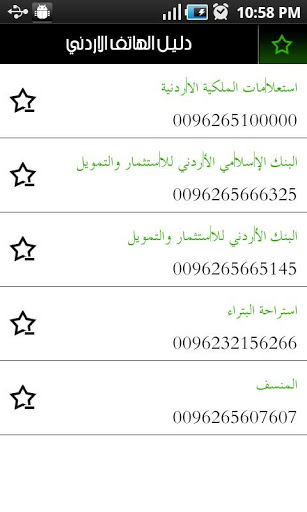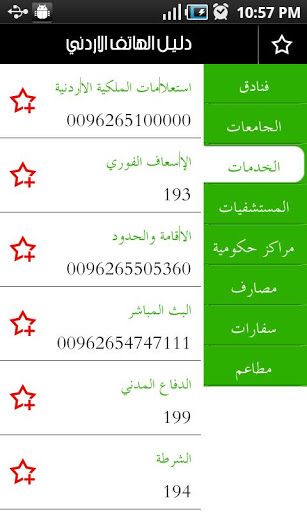 تطبيق يحتوي على دليل الهاتف الاردني حسب التصنيفات التاليه : الفنادق , الجامعات , الخدمات , المستشفيات , مراكز حكومية , مصارف , البنوك , سفارات , مطاعم ,الاطباء