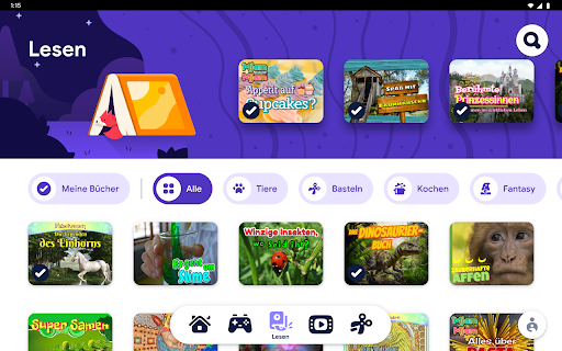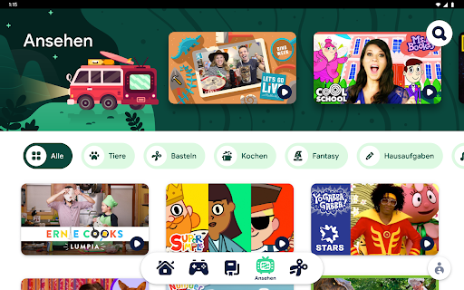 Wenn ein Kind Google Kids Space öffnet, sieht es eine Mediathek mit hochwertigen Inhalten. Kinder sehen Empfehlungen für Apps, Spiele, Bücher und Videos. So können sie auf immer wieder neue Art und Weise spielen und lernen.
