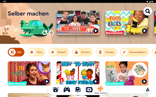 Auf dem Tab "Erstellen" werden Kinder dazu inspiriert, kreativ zu sein, Neues zu entdecken und ihre Fertigkeiten zu üben – mit empfohlenen Videos aus YouTube Kids. Von einfachen Zeichenübungen bis hin zu witzigen wissenschaftlichen Experimenten – hier ist für jeden etwas dabei.
