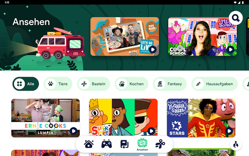 In Google Kids Space werden deinem Kind kreative, interessante Videos aus YouTube Kids vorgeschlagen. Ob Kinder lernen, singen oder lachen möchten – jetzt können sie sich Videos zu Themen und mit Figuren ansehen, die sie begeistern.