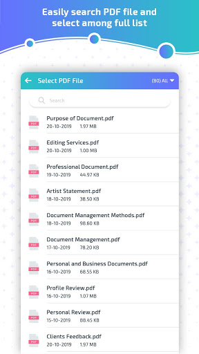 - Einfach, die PDF-Datei aus der Liste auszuwählen oder eine direkte Suchoption auszusetzen, um die Datei auszuwählen, zudem die Datei nach Namen und Größe sortieren.